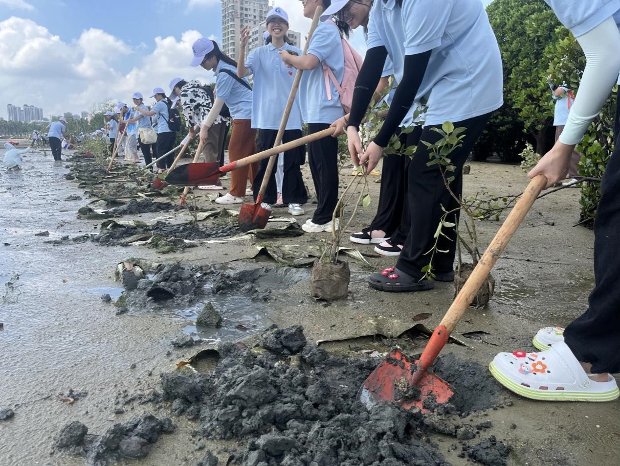 启动仪式结束后,大学生志愿者团队陆续前往金沙湾海滩,正式开展净滩活动,朝气蓬勃的青春力量在沙滩上显现。一批志愿者手持红树苗、铁锹,不辞辛苦,在指定种植区域,对红树进行细致有序地挖坑、栽苗、填土、固定,为扩大红树林面积而不断努力着,助力“红树林之城”的建设;另一批志愿者们苦干实干,戴上手套,拿起夹子,与垃圾袋一起,沿着海岸线逐处详细检查,拾海洋垃圾,还洁净大海,不放过任何一项垃圾危害。