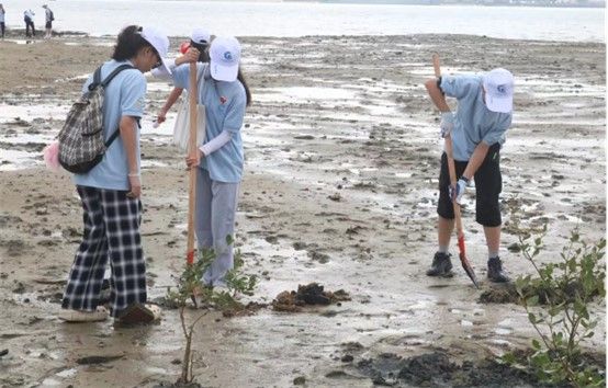 在沙滩上行走,享受海风徐徐。经过为期三小时的现场志愿活动,金沙湾红树林片区海滩已焕然一新,众多的新苗被种下。相信在不久的将来,这些小树会连成一片,长成大树,形成更加丰富且完善的红树林片区。净滩活动的进行,促使海洋生物活动空间更广阔便利,一行行白鹭在海滩上飞翔,布满螃蟹孔洞的海滩也显得格外和谐。