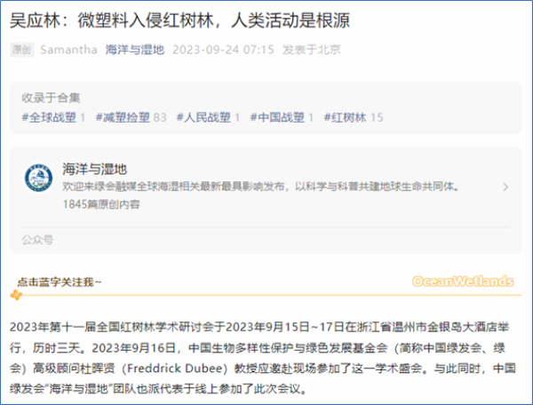 我院红树林研究团队成员一直积极跟随国际学术前沿开展科学研究和服务社会需求。本次会议取得了一定的成效。会议报告中的部分内容被长期专门从事海洋与湿地前沿动态的科普传媒引用,以呼吁加强红树林微塑料污染治理和保护。经过本次会议交流,增进了我院教师和全国红树林研究团队之间的互相了解,为我院扩大红树林研究的社会影响力提供了契机。