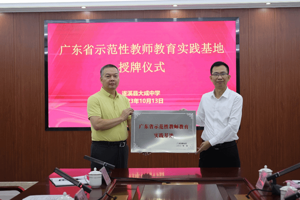 刘锴栋院长代表生科院向遂溪县大成中学授牌,遂溪县大成中学陈华强校长代表学校接受授牌。