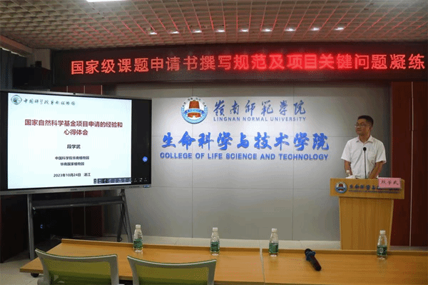 为提升生科院学术氛围、促进教师的专业化成长,我院邀请了中国科学院华南植物园段学武研究员作题为 “国家级课题申请书撰写规范及项目相关问题凝练”的专题讲座,讲座于10月24日在岭南师范学院第四教学大楼E507学术报告厅召开,生科院刘锴栋院长主持本次讲座。