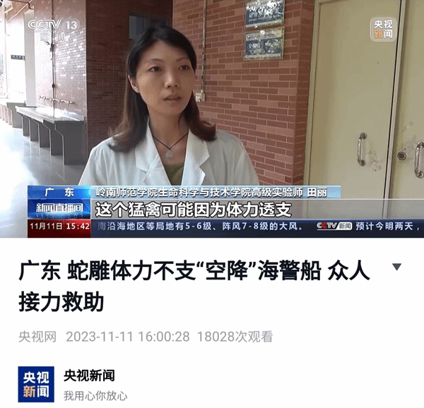 2023年11月11日,央视新闻频道新闻直播间播发了一则关于“蛇雕体力不支空降海警船,众人接力救助,6年后再次寻觅蛇雕”的新闻。我院田丽老师作为救助专家受邀接受采访,采访视频以及田丽老师救助蛇雕的事迹在央视新闻里进行了播放。