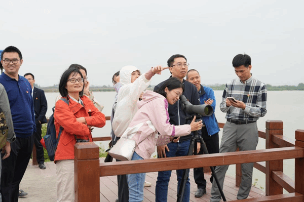 党员代表用望远镜观察鸟类