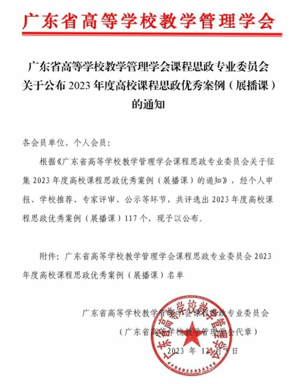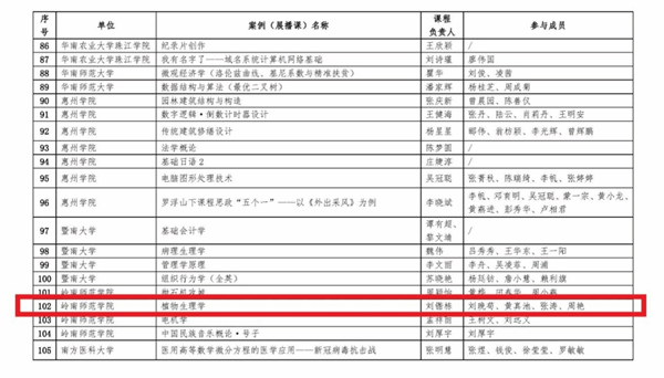 近日,由广东省高等学校教学管理学会课程思政专业委员会评选的“2023年度高校课程思政优秀案例(展播课)”名单正式公布,生科院刘锴栋刘晚苟、黄真池、张涛、周艳等老师共同承担的《植物生理学》课程成功入选。