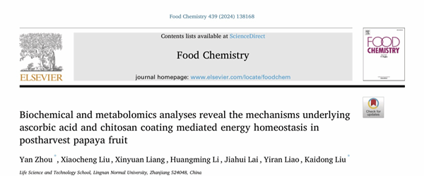近日,Food Chemistry(中国科学院1区;IF=8.8)杂志在线发表了我院刘锴栋教授(通讯作者)、周艳副教授(第一作者)题为“Biochemical and metabolomics analyses reveal the mechanisms underlying ascorbic acid and chitosan coating mediated energy homeostasis in postharvest papaya fruit”的研究论文,该研究的前期研究结果“The combined effect of ascorbic acid and chitosan coating on postharvest quality and cell wall metabolism of papaya fruits”已发表于食品领域权威期刊《LWT》(中科院一区,IF=6)。本研究揭示了AsA和 CTS 处理能够通过调控番木瓜果实的能量平衡以保持贮藏品质。该结果有助于深入了解 AsA和 CTS 处理调控番木瓜果实采后成熟和衰老的新机制。