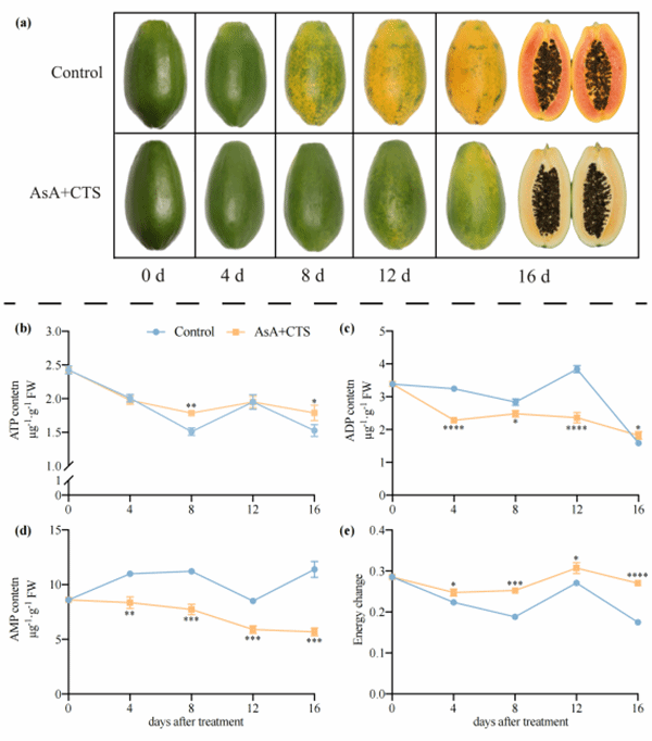 Fig. 1 The phenotype change of papaya fruit during postharvest storage (a). The effect of AsA+CTS treatment on ATP (b), ADP (c), AMP (d) and energy change (e) of of papaya fruit during postharvest storage. Each value is the mean ± standard error (n = 3), and the error bars represent the standard error. Bars with a different letter within a sampling date are significantly different (P < 0.05).