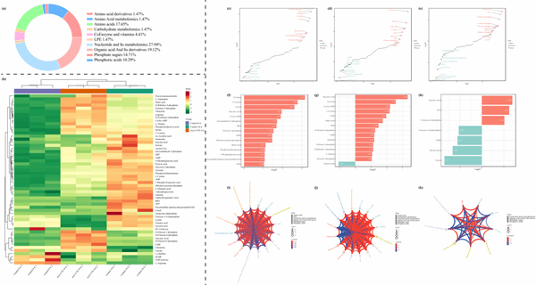 Fig.2 Biochemical classification and quantitative proportion of identified metabolites (a). Overall clustering map of the sample (b). Differential metabolite screening. c, d and e show the dynamic distribution of differential metabolic content, f, g and h present the bar chart of differential multiples, i, j and k display the chord diagram of differential metabolites. (c), (f) and (i) Control 16 d_vs_Control 0 d, (d), (g) and (j) AsA+CTS 16 d_vs_Control 0 d, (e), (h) and (k) AsA+CTS 16 d_vs_Control 16 d.