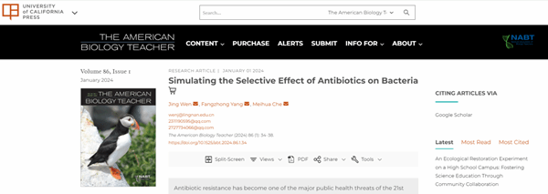近日,生科院文静老师及其所指导的2020级生物科学专业的本科生杨方忠、车梅华同学,在SCI收录期刊American Biology Teacher(中国科学院4区)发表了题为Simulating the Selective Effect of Antibiotics on Bacteria的教研论文。American Biology Teacher是美国生物教师协会 (NABT) 主办的一份专门针对K-16年级生物教师的专业期刊。