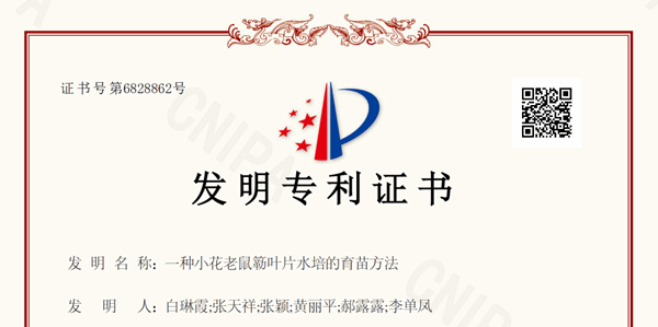 近日,我院张颖教授所带领课题组成员的科研成果“一种小花老鼠簕叶片水培的育苗方法”获授权国家发明专利,2020级生物技术专业白琳霞为第一发明人。课题组主要从事濒危红树植物种质资源繁育、保护与红树林生态恢复等方面的研究。