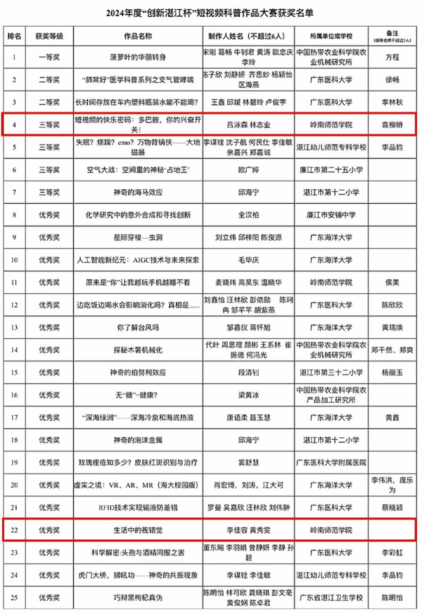 近日,由湛江市科学技术局、湛江市教育局、湛江市科学技术协会联合,主题为“科普在身边,携手向未来”的2024年度“创新湛江杯”短视频科普作品大赛获奖名单公布。校生命科学与技术学院吕泳森、林志业同学(指导老师:袁柳娇)获得三等奖1项综合评分排名第4,李佳容黄秀雯同学获得优秀1项。