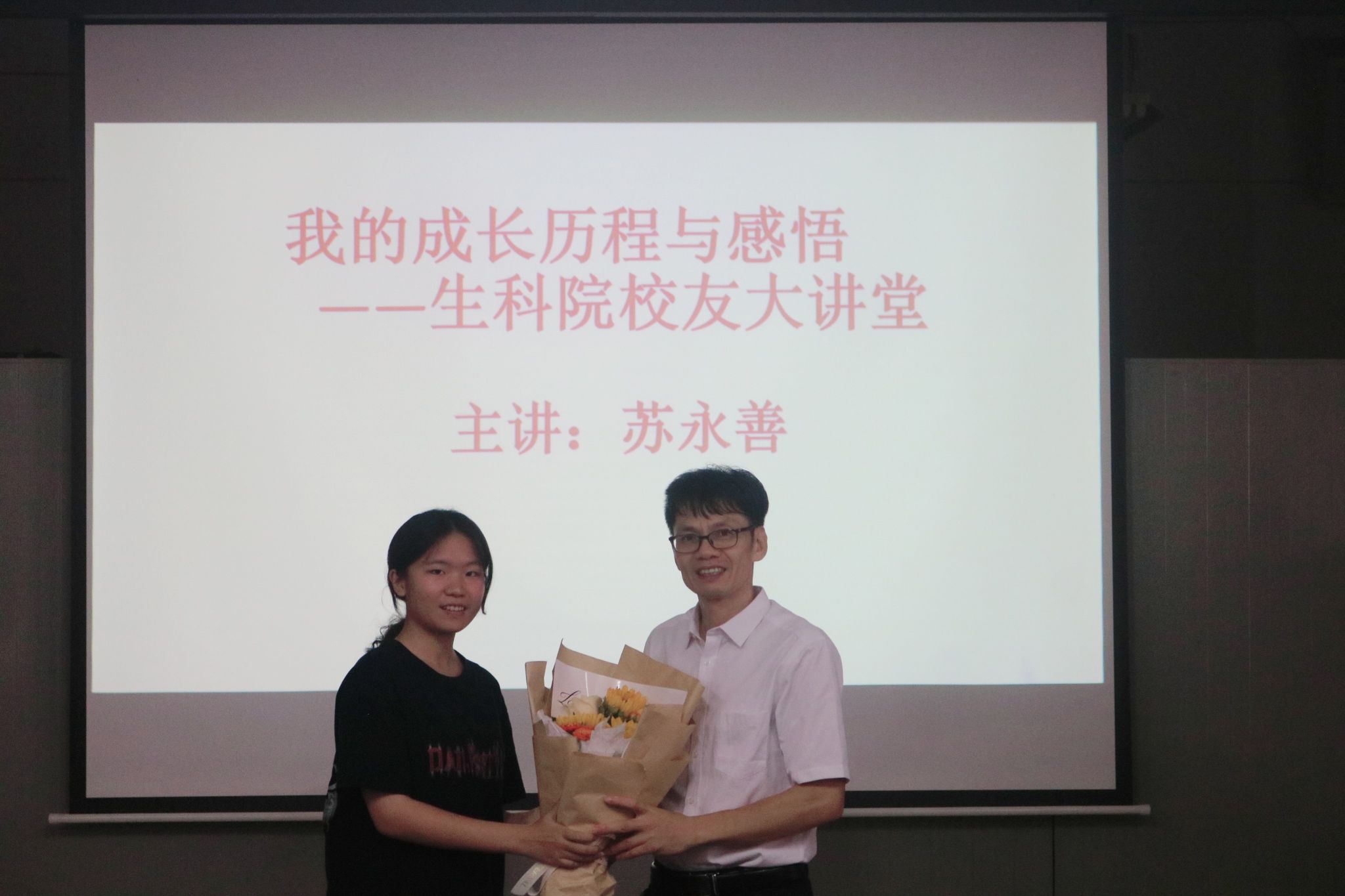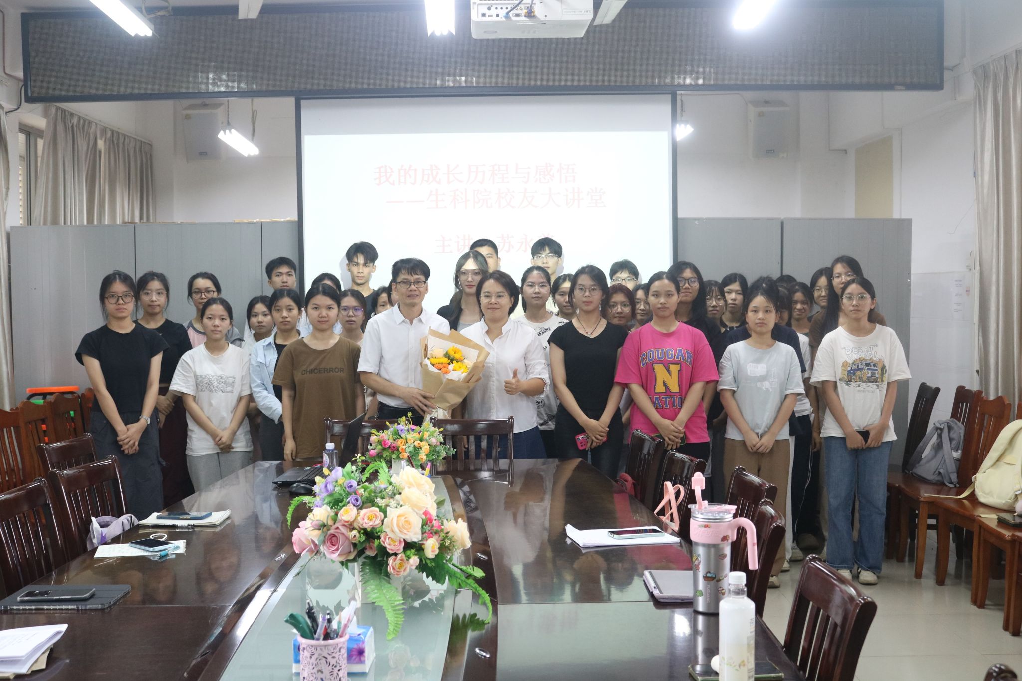 为激励生科学子关注自我成长,提升自身学习能力,生科院特邀1994届优秀校友苏永善于2024年6月20日在第四教学楼D栋505举办以“我的成长历程与感悟”为主题的校友大讲堂,生科院党委书记李发武、院长刘锴栋、党委副书记覃静君以及学生代表参加讲堂。生科院友研中心指导老师潘晓艳主持会议。