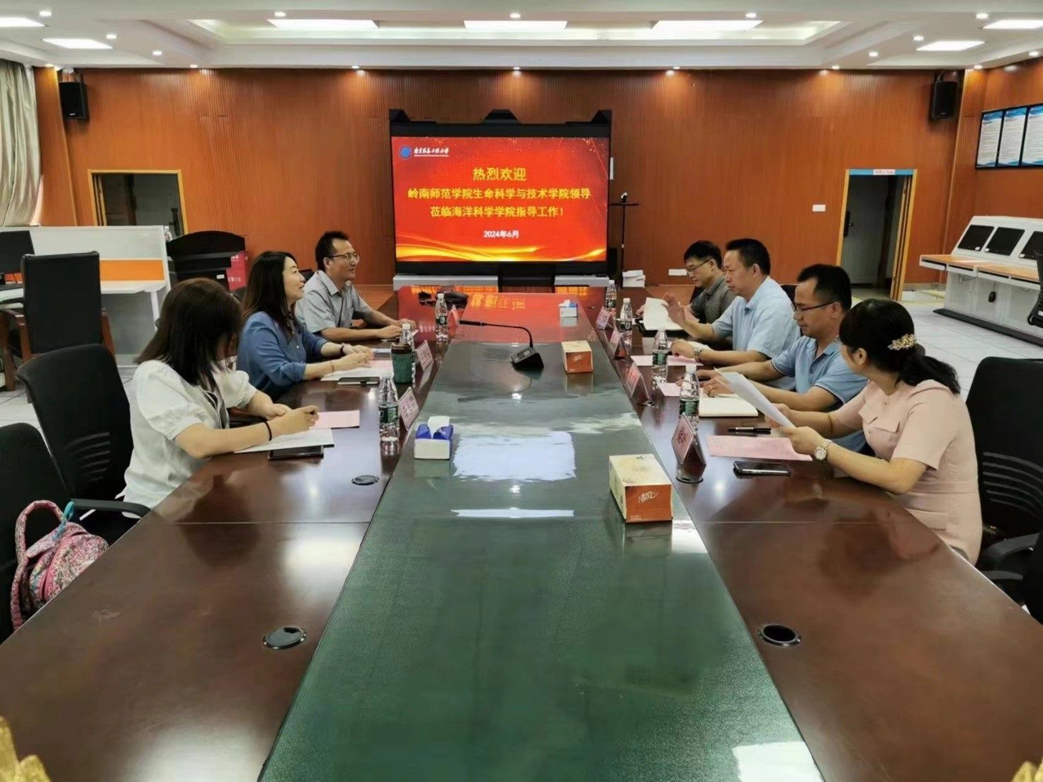 之后,我院一行三人来到南京师范大学,与海洋科学与工程学院党委书记江胜尧、院长助理赵一飞、陈晔教授、杨阳研究员、张凯副教授、辅导员范念慈老师进行座谈交流。江胜尧书记系统介绍了南师大海洋学院的发展历程。王锂韫副院长介绍了我院概况及海洋资源开发技术专业的建设特色与发展情况,双方就海洋专业高水平师资建设、生源质量保障、教学质量提升、高水平科研及平台建设等进行了深入交流,并就开展科研合作,协作共进交换了意见。会后,我院教师参观了教学与科研实验室、海洋科普展览馆等。