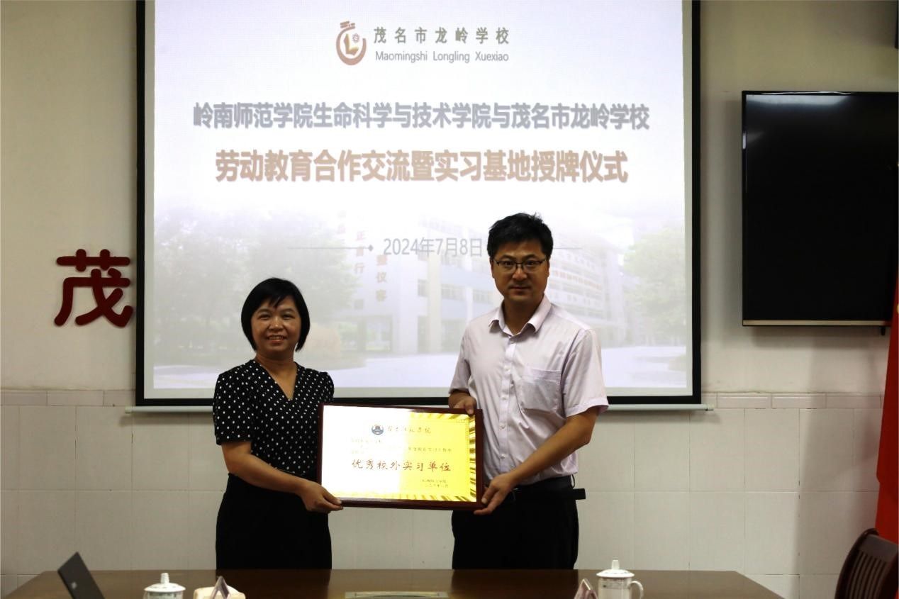 孙余丹副院长代表生科院向茂名市龙岭学校授优秀校外实习单位牌匾,茂名市龙岭学校陈晓霞副校长代表学校接受授牌。