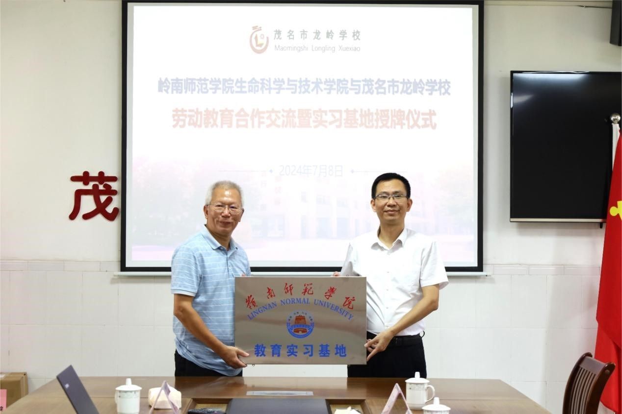 刘锴栋院长代表学校向茂名市龙岭学校授教育实习基地牌匾,茂名市龙岭学校黄日周校长代表学校接受授牌。