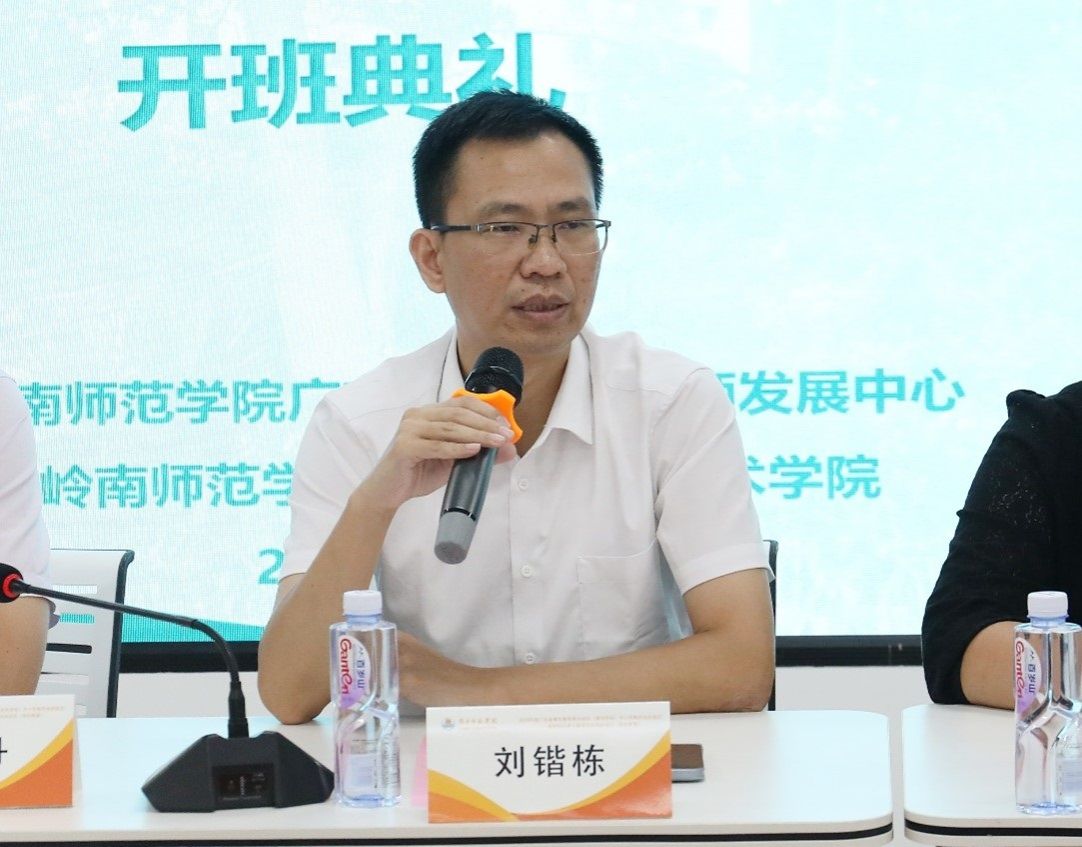 刘锴栋为培训班开班致辞。他代表生科院和项目组对各位学员的到来表示热烈的欢迎。他对岭南师范学院的办学历史、办学条件、师资力量和培训经验进行了介绍,同时他对生科院的专业设置、师资队伍和实验条件也进行了讲解。他指出,生科院具有丰富的中学师资培训经验,本次培训班项目组做了大量的准备工作,力求能给全体学员带来一次良好的培训体验。他对学员提出了两点点希望:一是提高政治站位,充分认识劳动教育的重要性。《中共中央国务院关于全面加强新时代大中小学劳动教育的意见》、《大中小学劳动教育指导纲要(试行)》这些文件都充分说明劳动教育的重要性,每位学员都要高度重视此次培训,力争圆满完成培训;二是强化学习成效,努力将培训所学转变为今后工作成效。他希望学员珍惜这次难得的学习机会,认真学习、深入思考、积极实践,将学习收获转化为校本课程、教研课题和教学论文等成果。