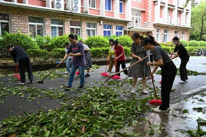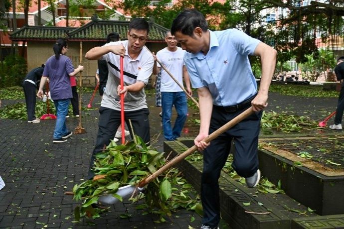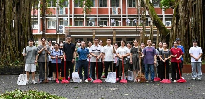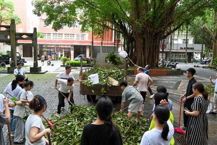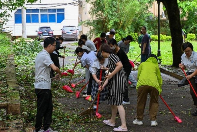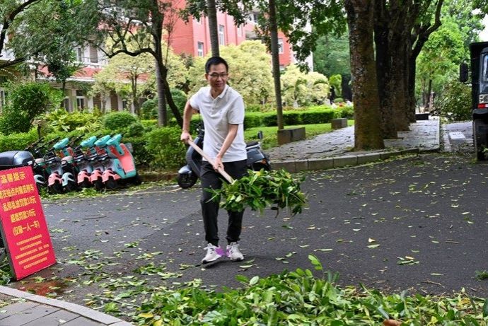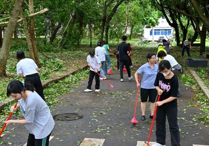 在学院领导班子的带领下,教工第一、第二党支部,红树林学生党支部、红嘴鸥学生党支部的党员们,三十多人,手持清扫工具,分组分片对校园主干道,古榕广场等区域进行了全面的清理。他们有的清理道路障碍,有的搬运倒伏的树木,有的则负责清扫垃圾和落叶。尽管天气依然阴沉,但党员们的热情却丝毫未减,他们忙碌的身影成为了校园中最亮丽的风景线。