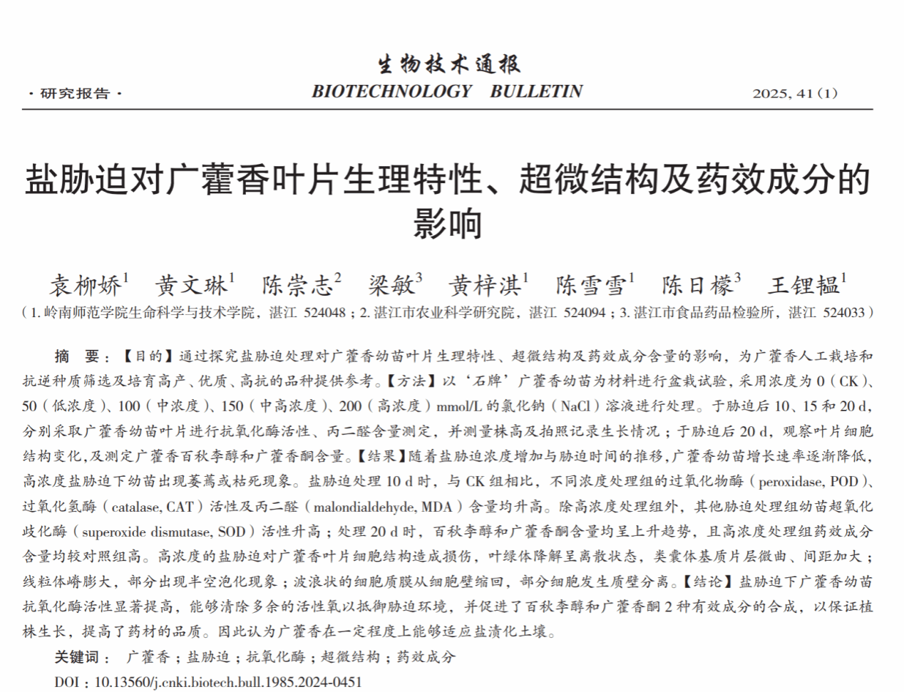 近日,生科院南药创新研究团队王锂韫教授、袁柳娇老师指导本科生黄文琳等同学在“中国科技期刊卓越行动计划梯队核心期刊”,“百种中国杰出学术期刊”《生物技术通报》上发表了题目为《盐胁迫对广藿香叶片生理特性、超微结构及药效成分的影响》的研究论文。