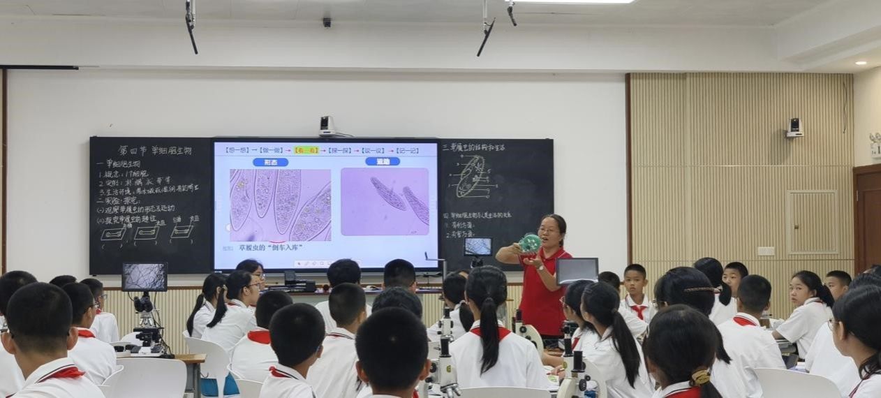 随后,珠海市容国团中学生物科组长邱建萍老师带来一节《显微镜的操作方法》实验课。邱建萍老师以课前让学生准备一瓶池塘水为导入,通过观看视频、学生操作、小组合作、老师检查等多种形式,让学生在实践中掌握显微镜的操作方法。在教学过程中,邱建萍老师注重与学生的互动,通过提问、讨论等方式激发学生的学习兴趣和积极性,提高了学生的参与度。邱建萍老师还利用投影、录像等多媒体手段辅助教学,使教学内容更加直观、生动,有助于学生的理解和记忆。