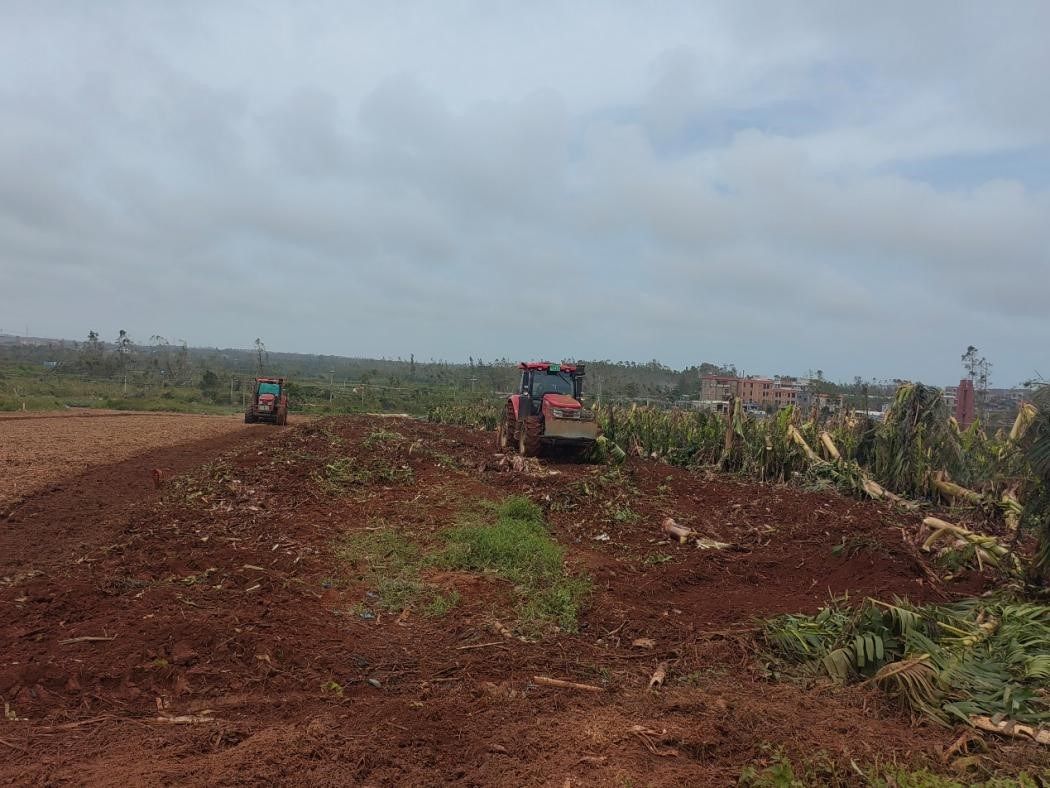 在徐闻县下洋镇,农业科技特派员团队积极指导农户第一时间开展抢收、清残保芽,以及排涝复种。应农户需求,农业科技特派员团队联系当地农机合作社,紧急调动香蕉树粉碎还田机械设备,充分发挥农业机械在灾后复产中的作用,开展香蕉树茎杆、根茬粉碎还田作业,助力农户尽快恢复生产。