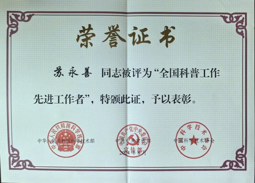 此次荣获“全国科普工作先进工作者”称号,对苏永善老师来说既是一份荣誉,也是一份责任。他表示将继续秉持初心,不断创新科普教育方式,为更多学生踏上探索科学知识的道路提供支持和帮助。