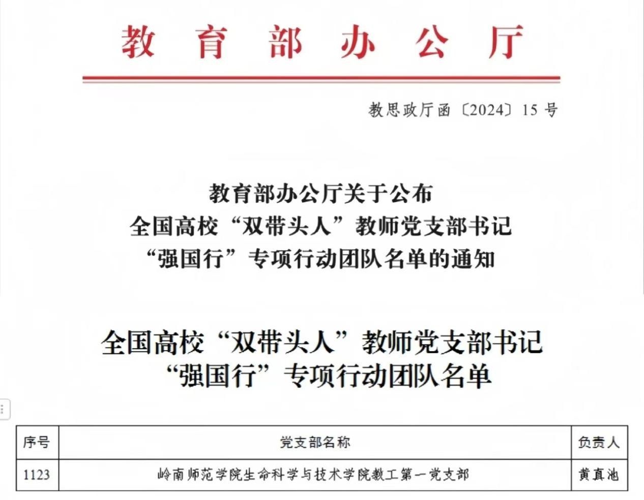 近日,岭南师范学院生命科学与技术学院党建工作又传来振奋人心的喜讯。近日,教育部办公厅公布全国高校“双带头人”教师党支部书记“强国行”专项行动团队名单。生科院教工第一党支部被确定为全国高校“双带头人”教师党支部书记“强国行”专项行动团队。