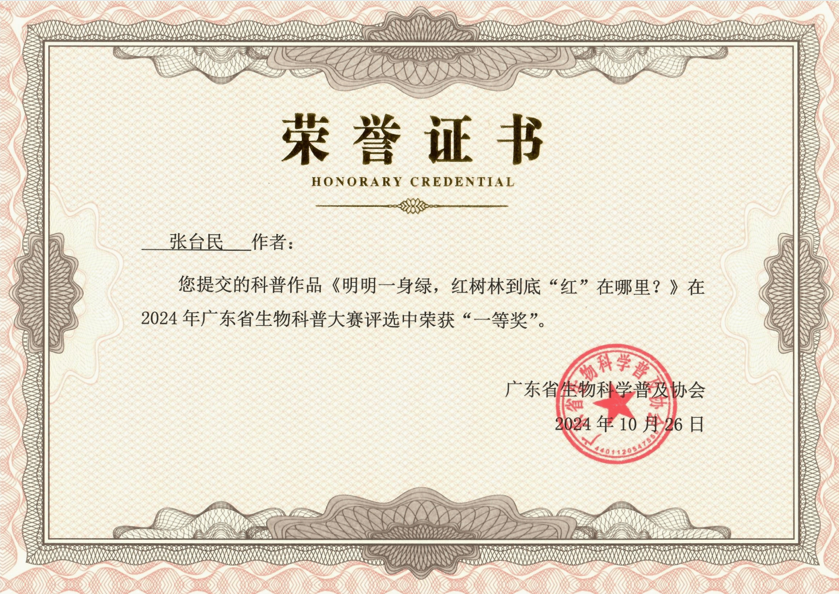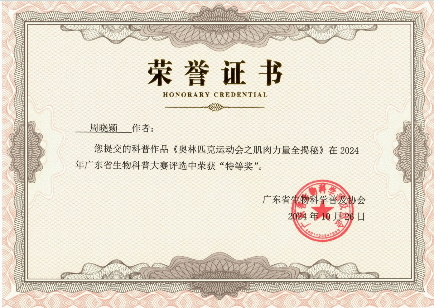 近日,由广东省生物科学普及协会、广东教育学会生物学教学专业委员会、广东省高考研究会生物学专家委员会联合主办的2024年广东省生物科普作品大赛在广州落下帷幕,我院周晓颖同学(指导老师:余小杏)获得广东省特等奖1项,张台民同学获得广东省一等奖1项。