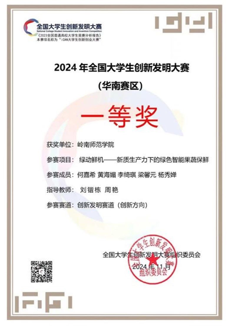 近日,2024年全国大学生创新发明大赛在江苏南京隆重举行。我院参赛团队凭借创新项目“绿动鲜机——新质生产力下的绿色智能果蔬保鲜”在华南赛区中荣获一等奖。