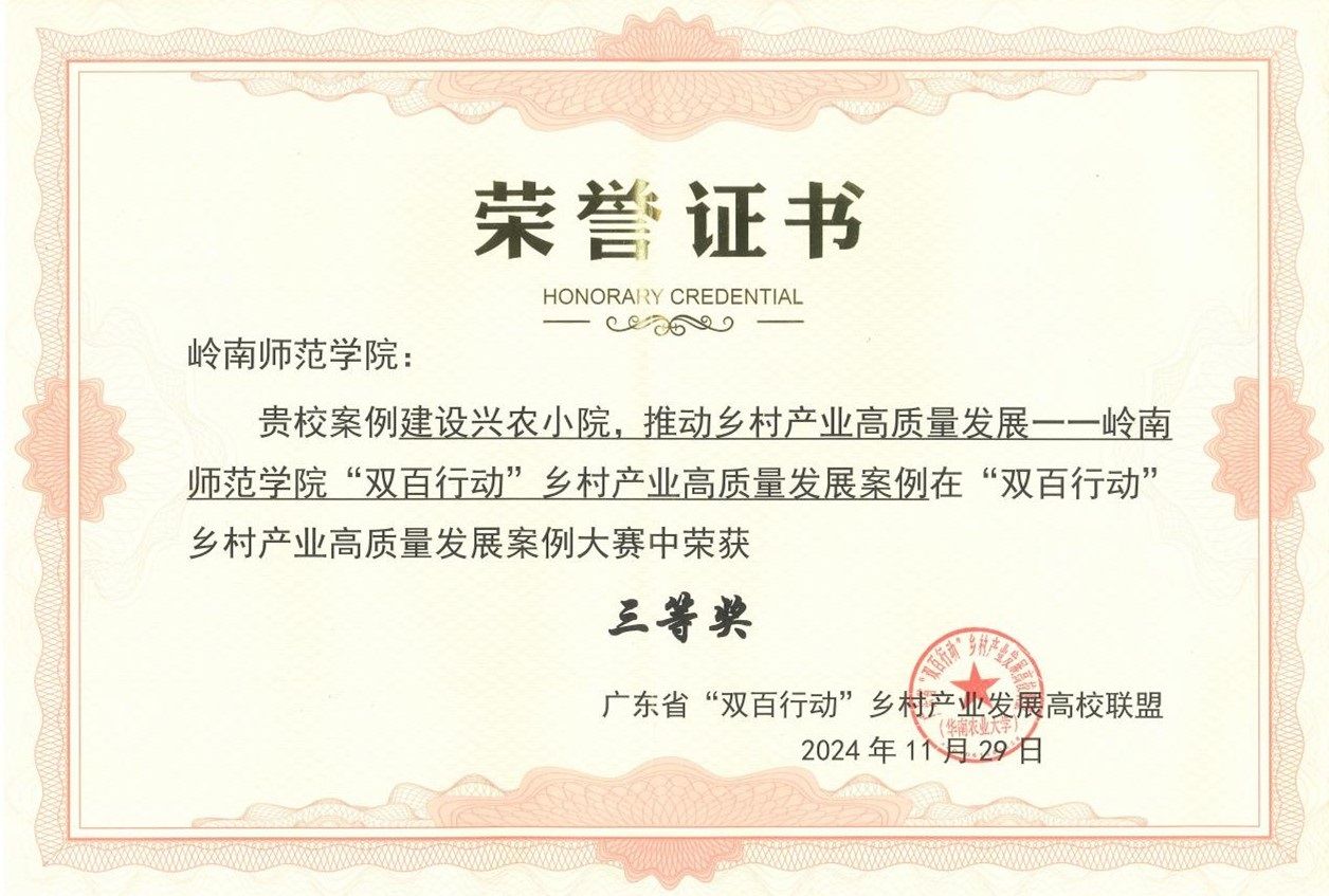 为持续优化农业科技创新生态,引导农业科技创新赋能“百千万工程”典型产业高质量发展,探索“科技-市场-产业”良性发展机制,营造农业发展新质生产力的良好环境,助力实现高水平农业科技自立自强,乡村产业高效联盟组织开展了“双百行动”乡村产业高质量发展案例大赛。大赛一共有28个单位推荐了56个案例,评选出31个获奖案例。其中,由生科院党委书记李发武、生科院院长刘锴栋、学校校地合作办主任钟召春联合撰写的《建设兴农小院,推动乡村产业高质量发展——岭南师范学院“双百行动”乡村产业高质量发展案例》荣获三等奖。