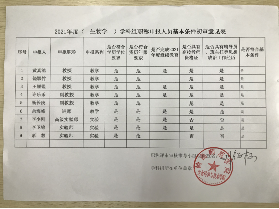 2021年度(生物学)学科组职称申报人员基本条件初审意见公示