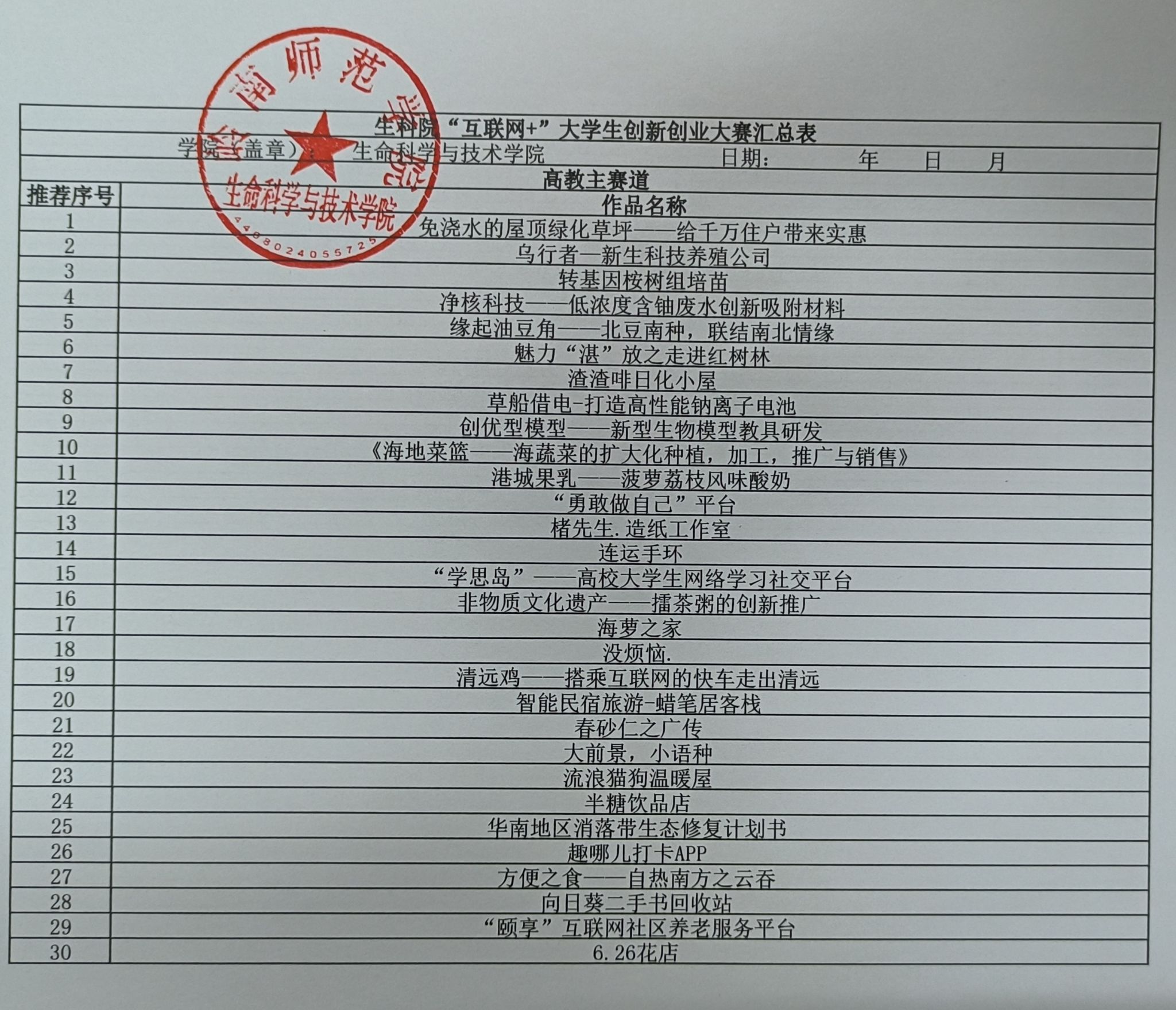 生科院第九届互联网+大赛推送进校赛名单公示