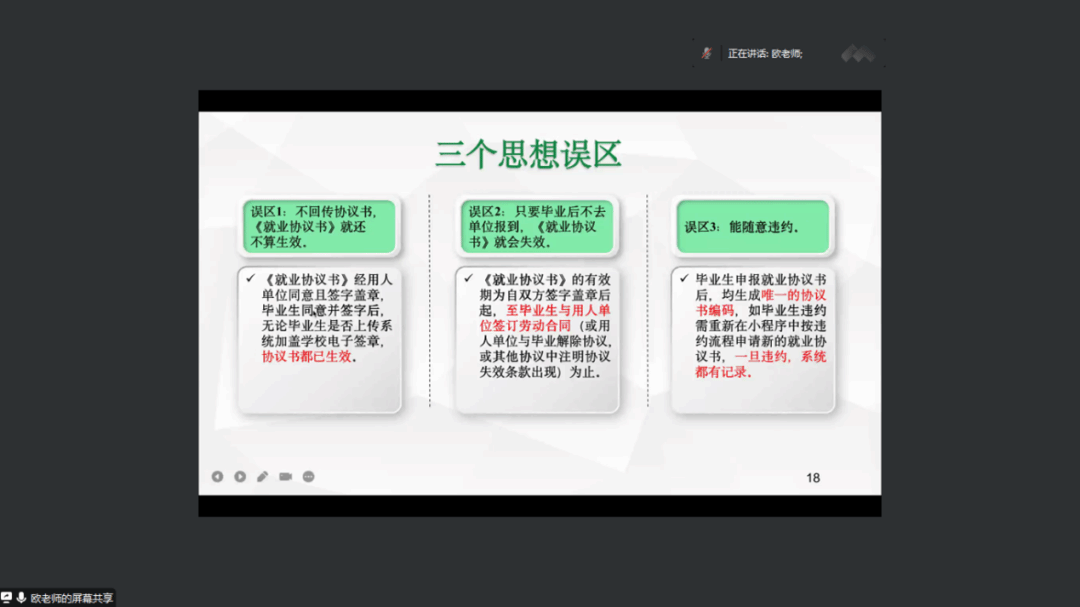 欧斯艳老师在会上进行了就业填报和相关政策的解读,向毕业生详细介绍了就业填报的步骤和注意事项,向同学们介绍了就业类型,三个思想误区以及毕业生就业扶持政策等方面的内容,同时强调要充分利用岭南师院就业官方网站和广东学生就业创业网。