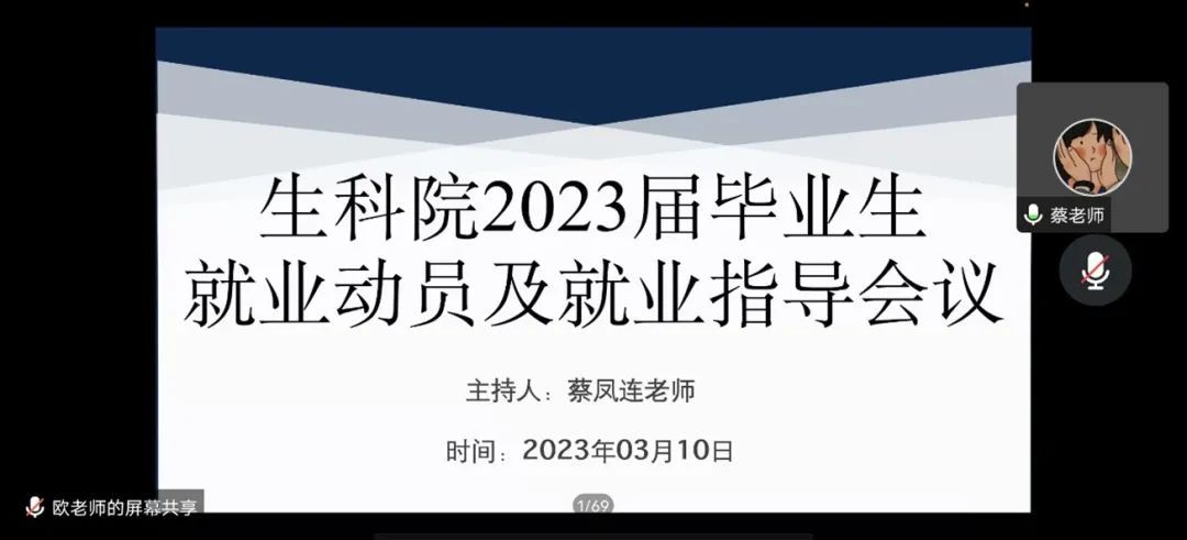 为扎实推进我院2023届毕业生就业工作,提高毕业生的就业质量,促进就业工作高速高质量完成。3月10日,生科院召开2023届毕业生就业推进会。本次推进会在腾讯会议召开,生科院党委副书记覃静君,辅导员欧斯艳老师、蔡凤连老师以及2023届毕业生出席会议。会议由蔡凤连老师主持。