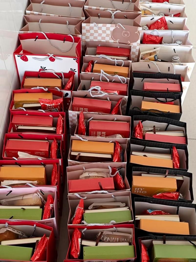 大礼包中有学院专门定制的考研笔记本,里面有2024届和2025届考研光荣榜,用榜样力量鼓舞今年的考研生;还有学院科研产品——热带水果果干,每一口都饱含着阳光的味道和学院满满的关爱,酸酸甜甜,为同学们在紧张的备考中带来味蕾的享受和身心的放松。其他精心准备的小吃也充满巧思与寓意:沙琪玛,愿同学们备考之路“顺顺当当”,每一步都扎实稳健,朝着目标稳步前进;巧克力派,希望大家能“派”除万难,无论遇到何种挑战都能从容应对、顺利攻克;娃哈哈AD钙奶,祝福同学们“活力满满笑哈哈”,以充沛精力投入复习,保持最佳备考状态;QQ糖,则寓意同学们“Q”掉难题 ,轻松应对备考中的挑战。