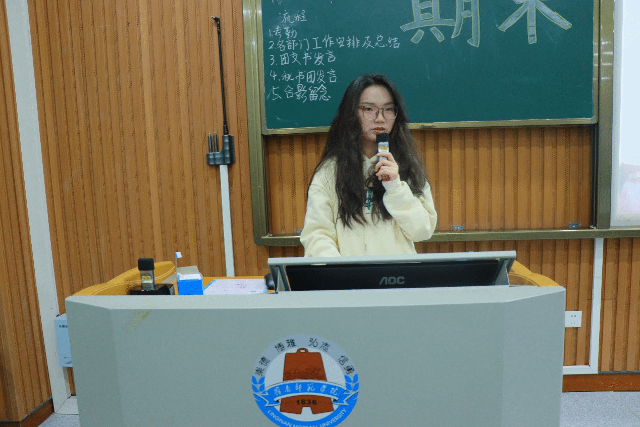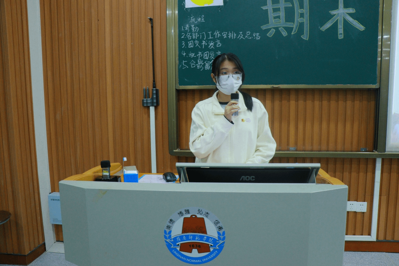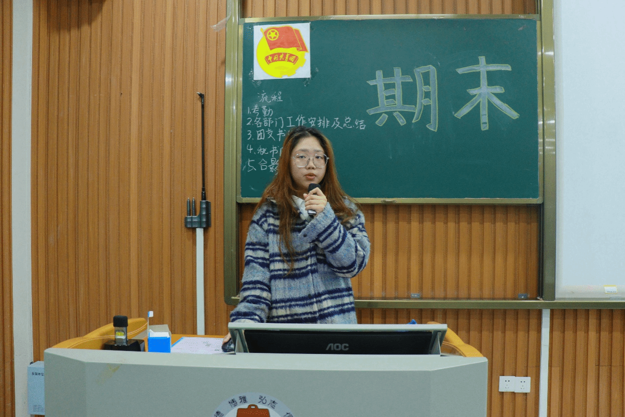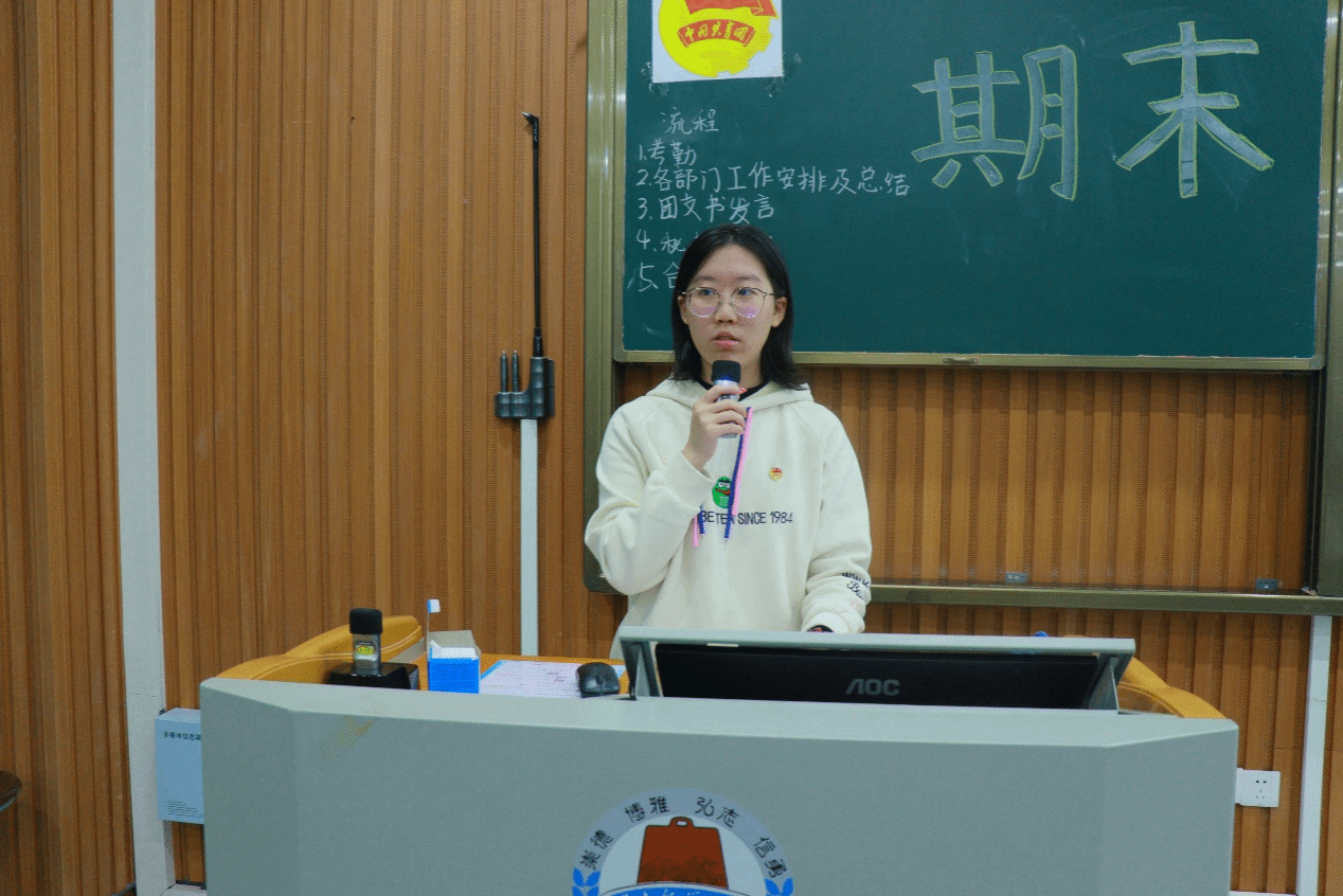 最后,团委秘书团成员黄海媚做期末总结大会的结束发言。她对前面会议内容进行了总结,对各支部团支书在工作中的出色表现给予了肯定与赞美。此外,她希望生科院团委的各位干部们在今后的工作中不忘初心,表现更加优异。