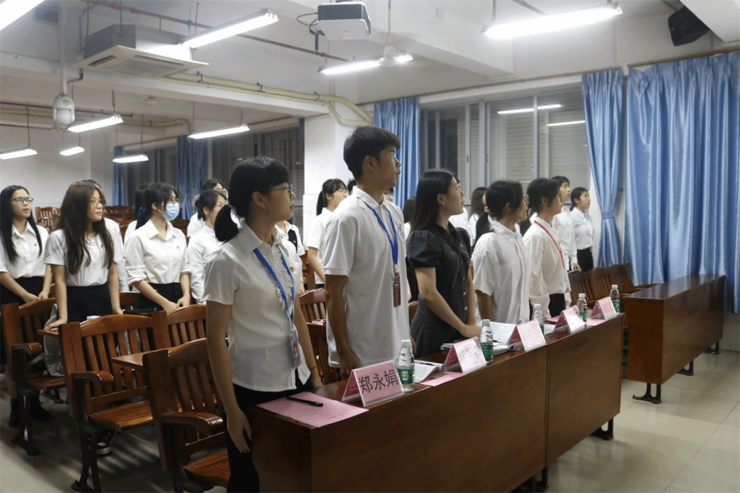 会议伊始,主持人组织参会人员庄重地合唱团歌。随后,各专业讲解员分别从综测与绩点、民主通过率、申请入党时间、座右铭以及优、缺点六个方面,对成功推优对象进行详细介绍。