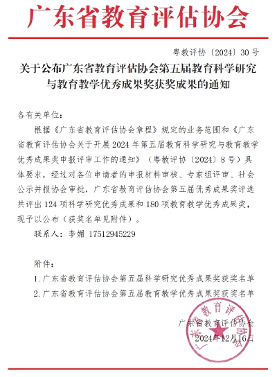近日,广东省教育评估协会公布第五届教育教学优秀成果奖获奖名单,我院喜获特等奖1项,二等奖2项。