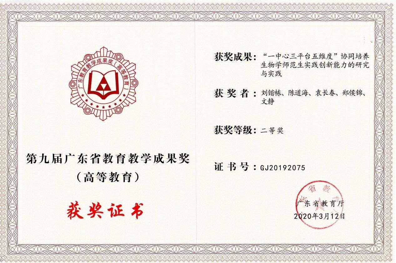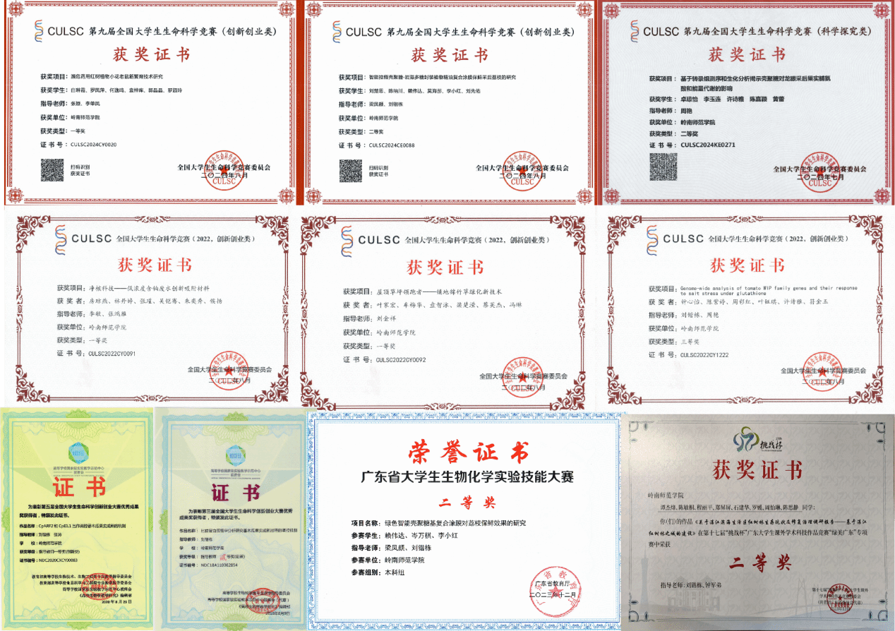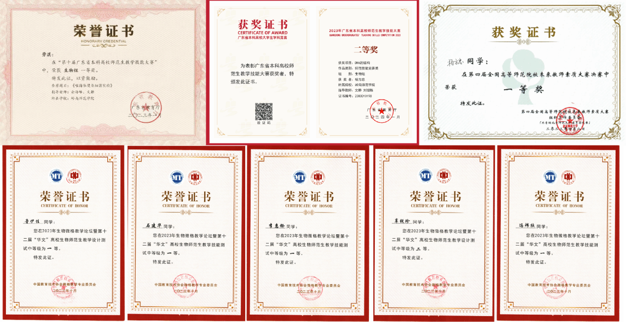 近年来,我院在全国及省级各类学科竞赛及师范生技能中成绩斐然。生命科学类专业学生获全国大学生生命科学竞赛(创新创业类)全国一等奖4项、二等奖15项、三等奖18项;获全国大学生生命科学竞赛(科学探究类)全国二等奖1项、三等奖4项;获广东省高校生化技能竞赛一等奖4项、二等奖4项、三等奖6项;获全国“华文杯”教学技能和设计大赛特等奖7项、一等奖15项、二等奖20项、三等奖1项;获省高校师范生教学技能大赛一等奖3项、二等奖5项、三等奖8项。
