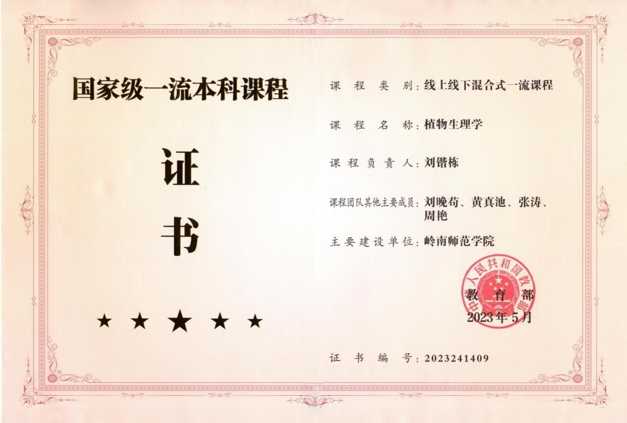 学院建有若干门国家级和省级课程。《植物生理学》课程被认定为2023年国家级一流本科课程、广东省一流课程。《分子生物学实验》被认定为广东省一流课程。教学成果《“一中心三平台五维度”协同培养生物学师范生实践创新能力的研究与实践》获2019年广东省高等教育教学成果二等奖,学院课程思政建设成果获2021年广东省本科高校课程思政优秀案例一等奖。学院在2020年度课程思政建设改革示范项目中被评为“示范学院”,学院的园林专业在2020年度课程思政建设改革示范项目中被评为“示范专业”。