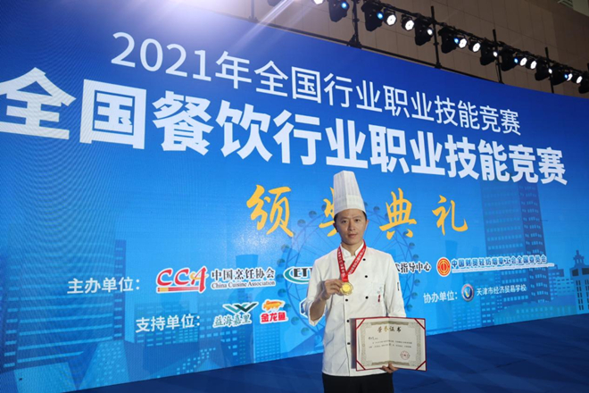 9月24日,由中国烹饪协会、中国就业培训技术指导中心、中国财贸轻纺烟草工会全国委员会联合主办的“2021年全国行业职业技能竞赛——全国餐饮行业职业技能竞赛”决赛在天津市举行。岭南师范学院食品科学与工程学院校友黄立飞代表广东省参加赛事,在赛事中稳定发挥,表现出色,斩获中式面点赛项金奖。