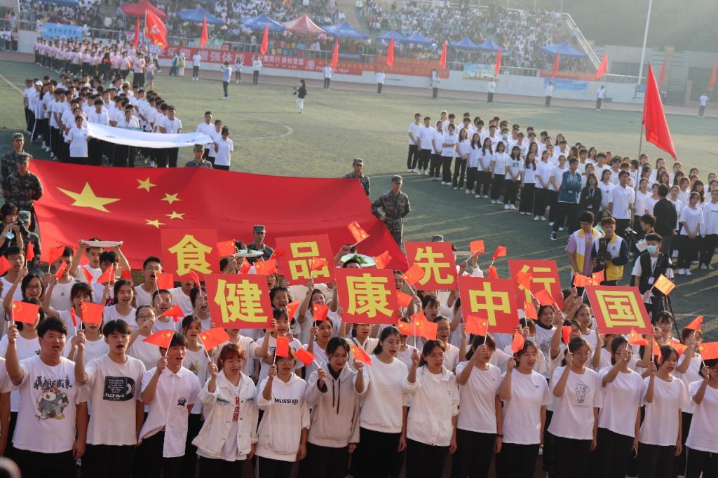校运会开幕式进行时,食品学院党委书记邱飞、副院长胡小军带领着学院方阵队伍,手持鲜艳的五星红旗,迈着矫健的步伐踏入会场,他们昂扬着姿态,面带自信的微笑,高高的举起字牌,“健康中国,食品先行”八个大字赫然出现。与此同时,高喊着清脆响亮、贯彻赛场的口号“食品精英、奋勇前行、齐心协力、共创佳绩”,这些无不展现着食品学院师生向阳而生、牢记使命、学以报国、积极进取的人生态度。