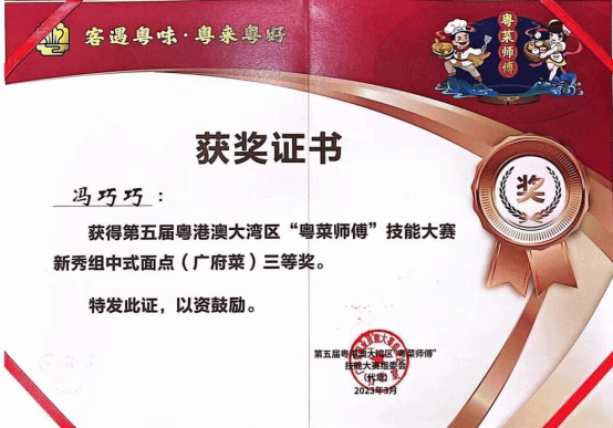 此次比赛共有一百多名选手同台竞技,其中新秀组由22位来自广东省22个地级市的选手代表组成,冯巧巧以市赛第一名的成绩代表湛江市参加此次省赛。比赛过程中,22个市级代表队分别烹饪不同的菜系,比如有广府菜、潮州菜、客家菜,冯巧巧荣获新秀组中式面点(广府菜)的三等奖。
