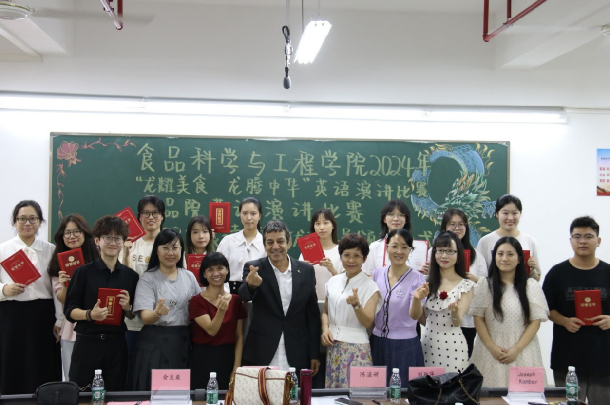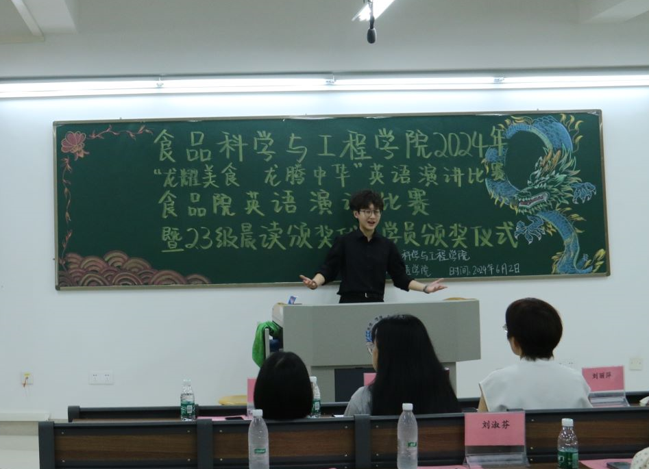 6月2日晚,食品科学与工程学院于第五教学楼F栋212室举行2024年“龙耀美食 龙腾中华”英语演讲比赛,参与本次活动的有党委副书记刘淑芬,外国语学院副院长陈湛妍,指导教师刘丽萍、庞宇艳老师、俞炎燊、外教Joseph Kamber,辅导员苏琳。活动由23级烹饪与营养教育国际2班冯思源、刘欣宇主持,21级、22级、23级国际班学生参与本次活动。