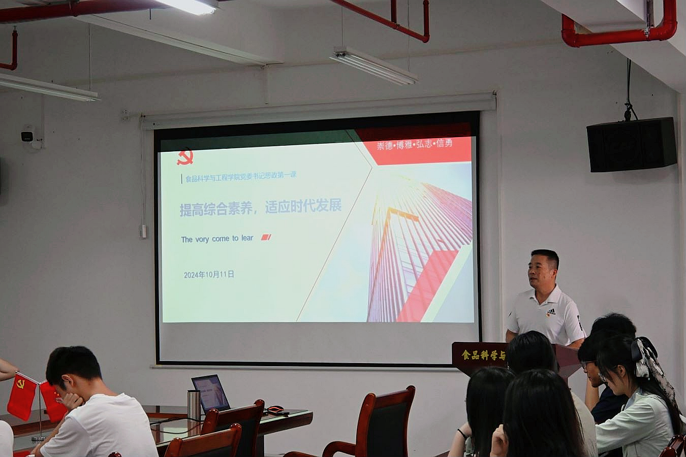 为引导学生树立正确的人生观、价值观和世界观,激发青年的责任感和使命感,10月11日下午,食品科学与工程学院党委书记邱飞于第五教学楼B栋318室讲授2024年度秋季学期“思政第一课”。党委副书记刘淑芬,辅导员袁嘉渝、苏琳、邓超龙及2024级国际班学生参加学习。