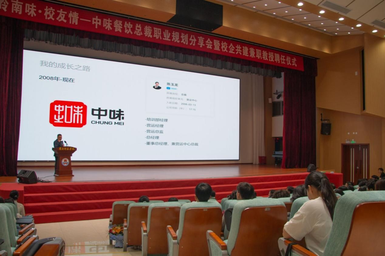 为深化产教融合,拓展学生职业发展规划视野,5月10日上午,食品科学与工程学院在音乐厅隆重举行"岭南味·校友情——中味餐饮总裁‘行走的思政课堂’"职业规划分享会暨校企共建兼职教授聘任仪式。本次活动作为学校"行走的思政课堂"系列活动的第二期,邀请食品科学与工程学院烹饪与营养教育专业1997级杰出校友、广州中味餐饮服务有限公司董事总经理兼营运总裁陈玉龙担任主讲嘉宾,学校副校长金义富教授、马克思主义学院党总支书记邓倩文、食品科学与工程学院党政领导及广州中味餐饮管理团队出席活动,300余名师生代表共同参与。会议由食品科学与工程学院党委书记邱飞主持。