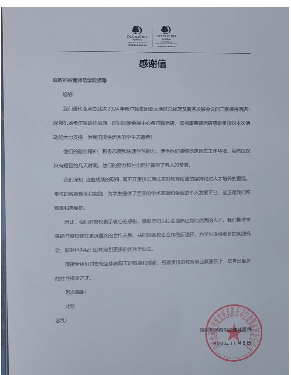 为更好地保障2024年希尔顿集团亚太地区酒店总经理及商务发展会议服务工作,搭建校企合作学生实践能力锻炼平台,20241030-119日,岭南师范学院食品科学与工程学院烹饪与营养教育专业一共42名学生前往深圳机场希尔顿逸林酒店、深圳康莱德酒店、深圳国际会展中心希尔顿酒店担任希尔顿国际会议的志愿者,全程协助做好大会的有关服务保障工作。
