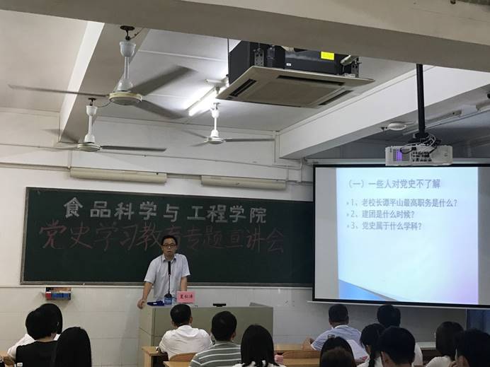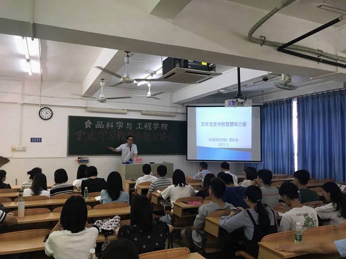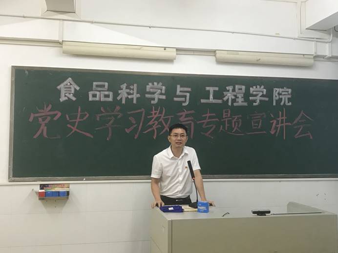 为进一步落实中央、省委、市委关于党史学习教育的部署,推动党史学习教育扎实深入开展,5月14日下午,食品科学与工程学院邀请学校党史宣讲团成员、马克思主义学院副院长夏松涛教授在第四教学楼C栋602召开党史学习教育专题宣讲会。食品学院全体教职工党员、学生党员及各班班干参加了学习,宣讲会由党委书记欧海清主持。