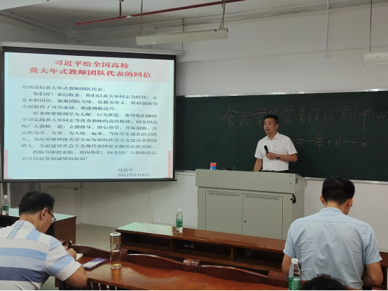 10月11日晚,食品科学与工程学院召开党委理论学习中心组第六期学习会议,深入传达学习贯彻习近平总书记给全国高校黄大年式教师团队代表重要回信精神,贯彻落实有关意识形态工作的重要制度。参与本次中心组学习的人员有学院党政班子成员、纪委成员、党支部书记及中层管理干部,会议由党委书记邱飞主持。