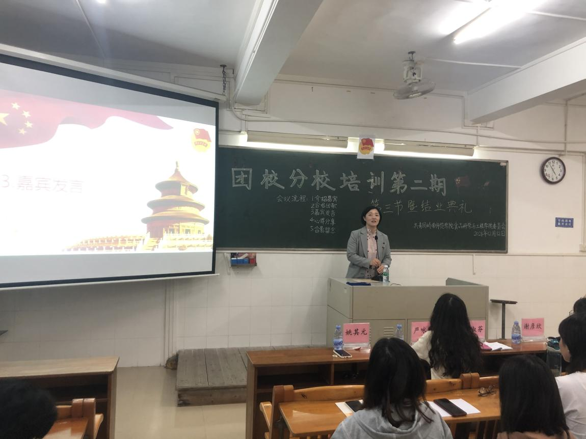 会议渐近尾声,团委指导老师姚其元为团校分校培训结业典礼致辞,她表达了对学员们的期望,希望大家制定目标,找准方向,以身边的优秀大学生为榜样,提升自己,争做优秀青年。