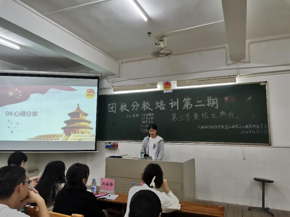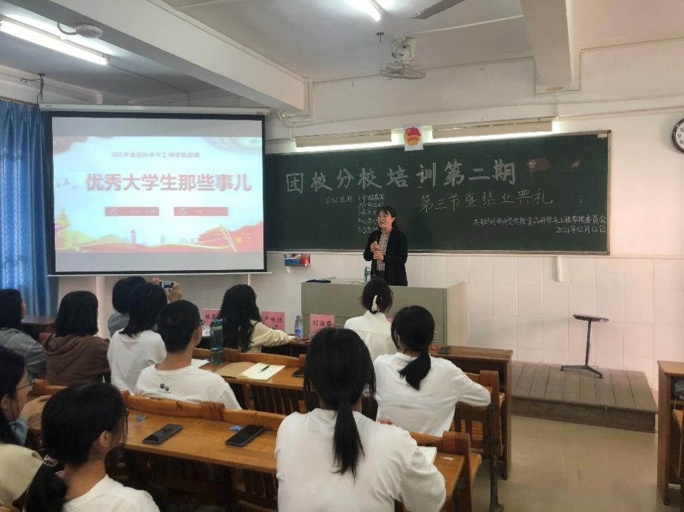 12月12日下午15:30,食品科学与工程学院团委在燕雷楼C-704开展共青团岭南师范学院委员会业余团校食品科学与工程学院分校团校培训课第二期第三节暨结业典礼。学院党委副书记刘淑芬以《优秀大学生那些事儿》为主题,为全体分团校学员开讲最后一课。