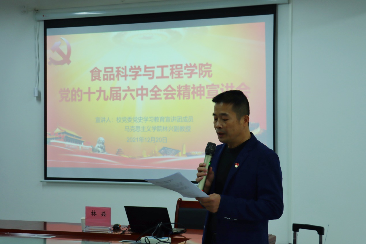 12月20日下午,食品科学与工程学院于第五教学楼B栋318室召开党的十九届六中全会精神宣讲会,旨在深入学习党的十九届六中全会精神,切实做好党史学习教育。参加本次会议的人员有学院全体教职员工、学生党员、发展对象、学生干部等。会议由学院党委书记邱飞主持,特邀校党委党史学习教育宣讲团成员、马克思主义学院林兴副教授担任主讲人。